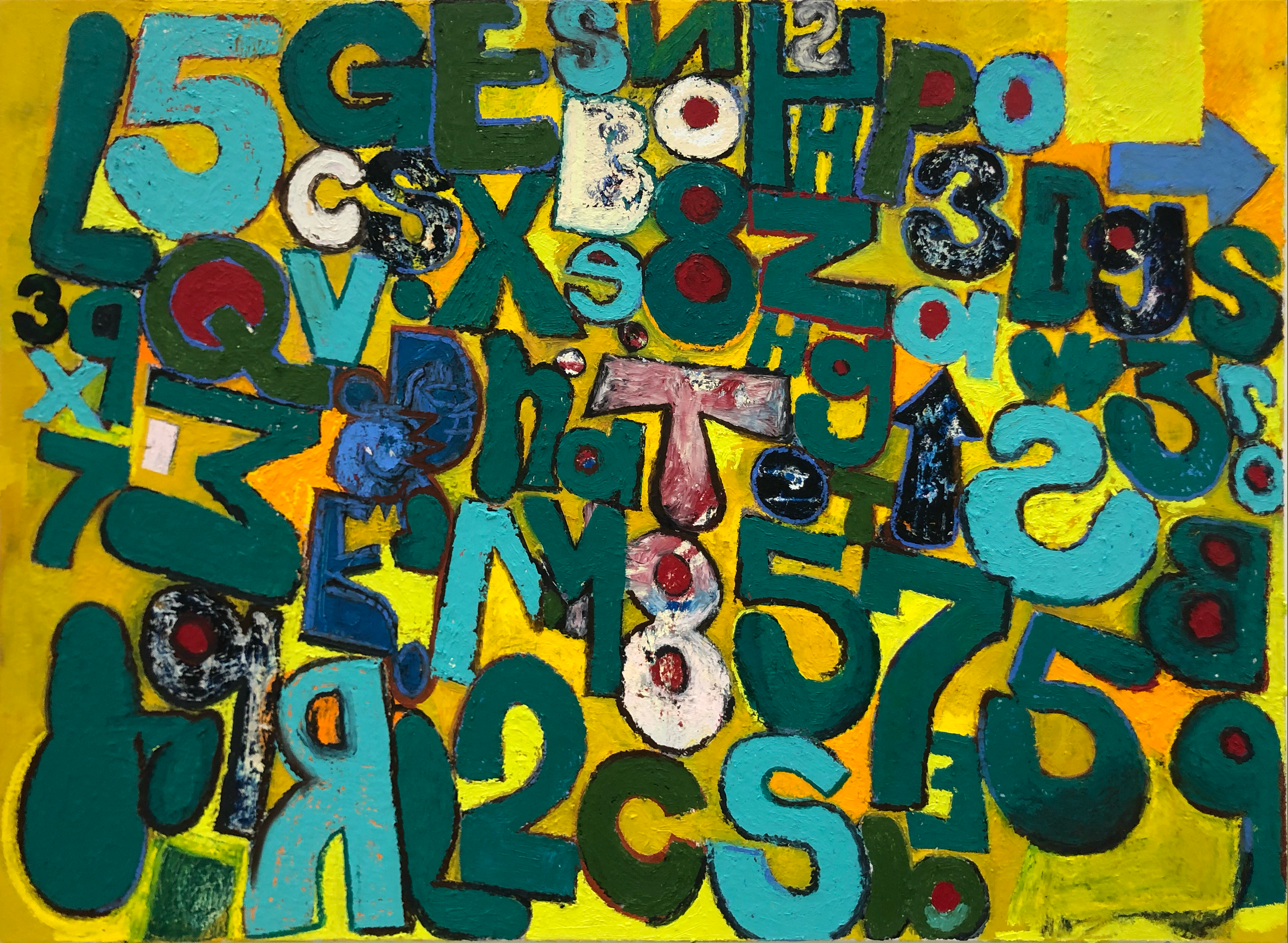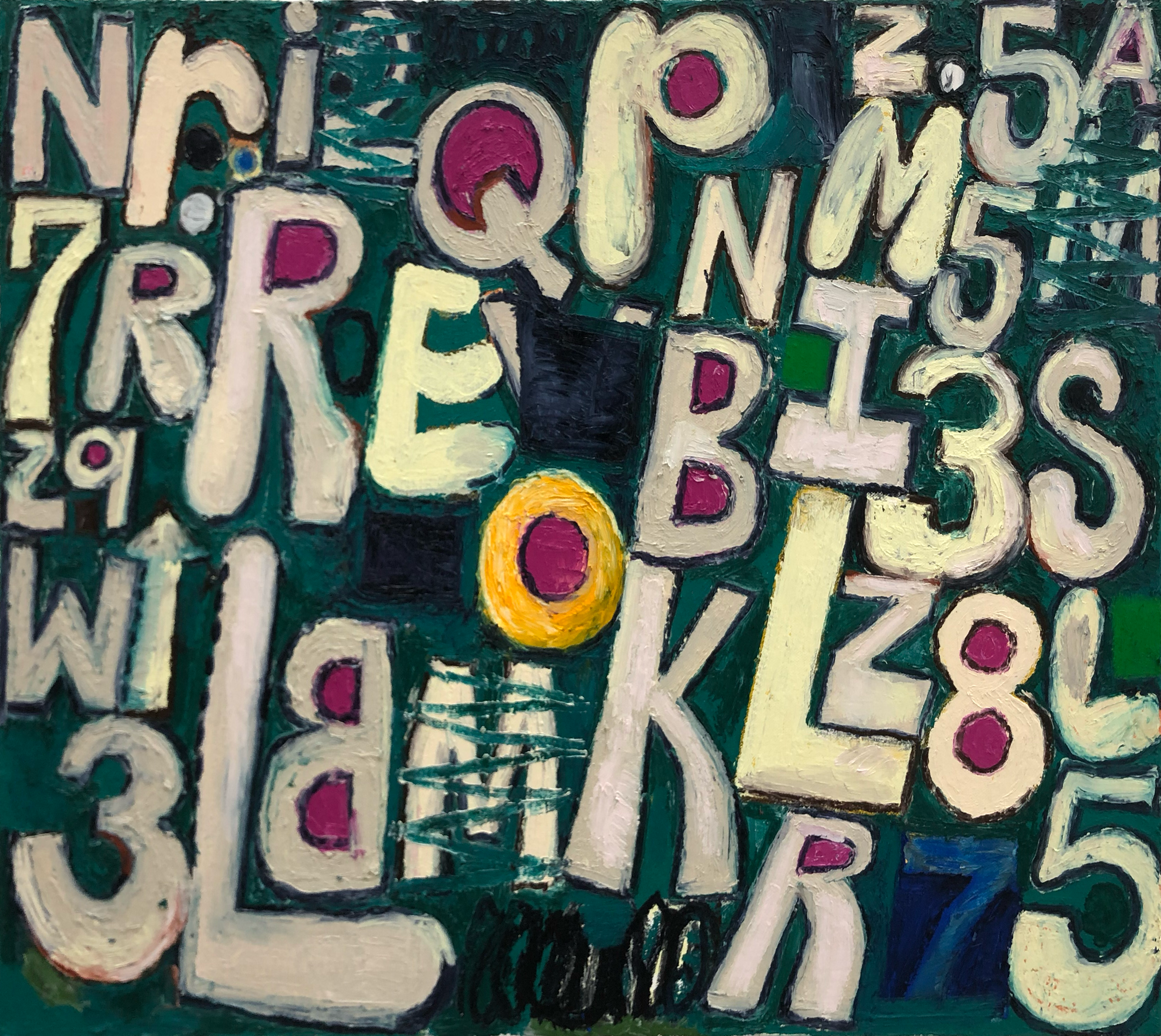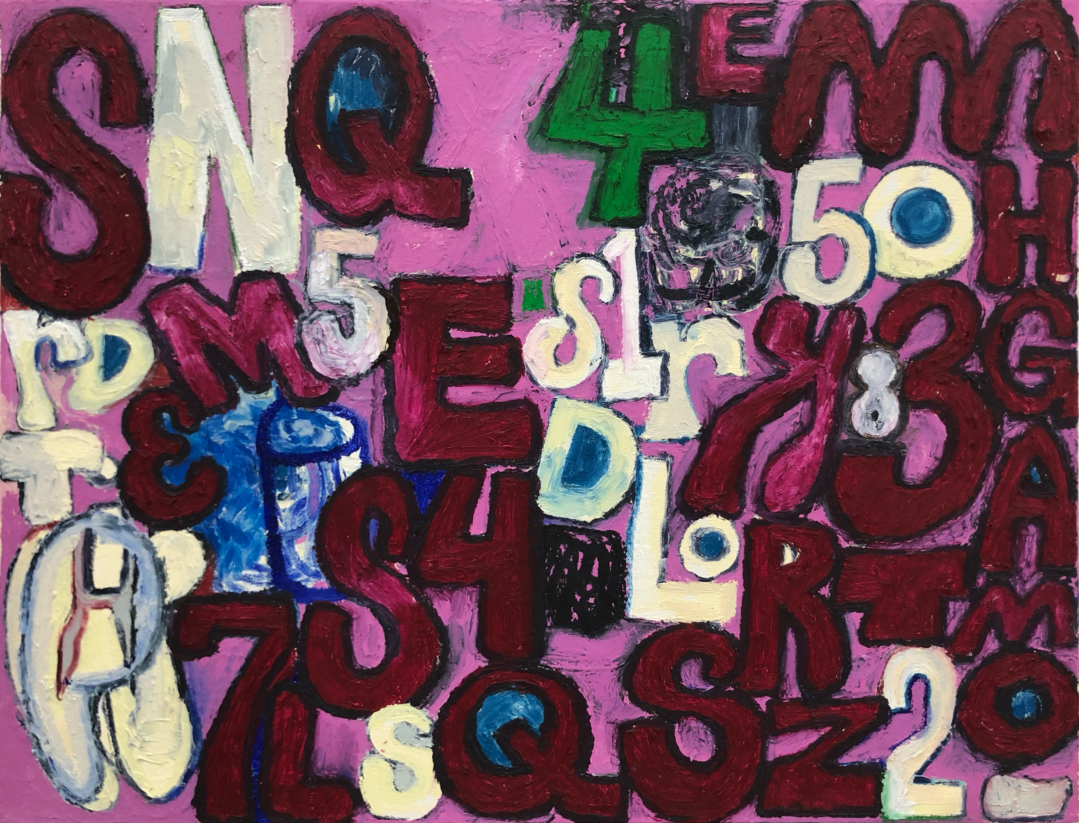 The paintings in "number racket" grew out of a series of oil stick drawings and also some marker drawings that I have been chipping away at for the past year. About six years ago, I started making tightly-wound, abstract paintings and drawings consisting of manic scribbles, stuttering marks, and blobs of color. When "working abstractly, you occasionally stumble into the representational, and there is the option to either embrace or destroy it, or side step it. I’d be working on a painting and letters and numbers would emerge, and I would invite them in, call out to them, until eventually I found a way to paint/draw these letters and numbers. You can write out letters and numbers and you can draw them, and I'm interested in that difference. Every painting I do is rooted in drawing, and I love dragging one wet line of paint into another. I put the paint on rather than scrape it down so I can build it thick then back up again, scribble them out and then repaint them, usually working wet-into wet. As paintings go they are simple enough, consist- ing of figure, ground, and contour, each a different color. The "figure" in this case are the letters and the numbers, and even those to me are not as important as the negative space shapes between everything on the painting. the color is there to activate the negative space. I usually try to paint until something unexpected happens, whether it be a color choke, mark, or just the overall structure of the painting.