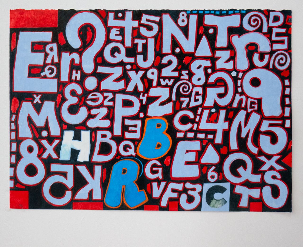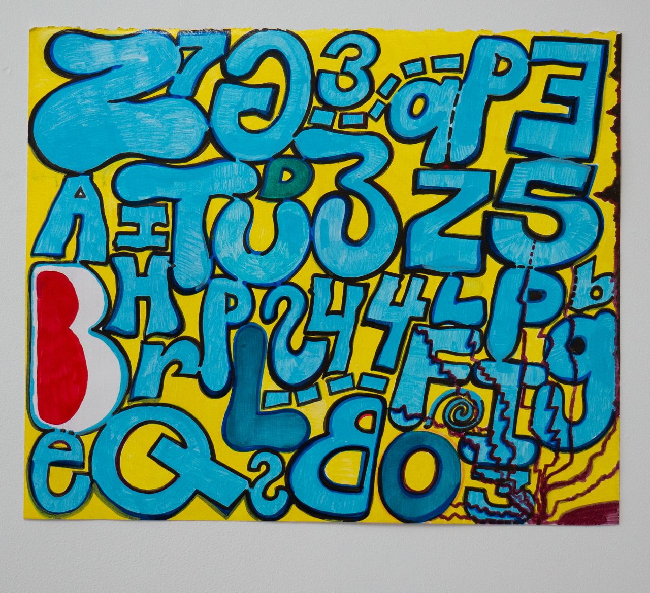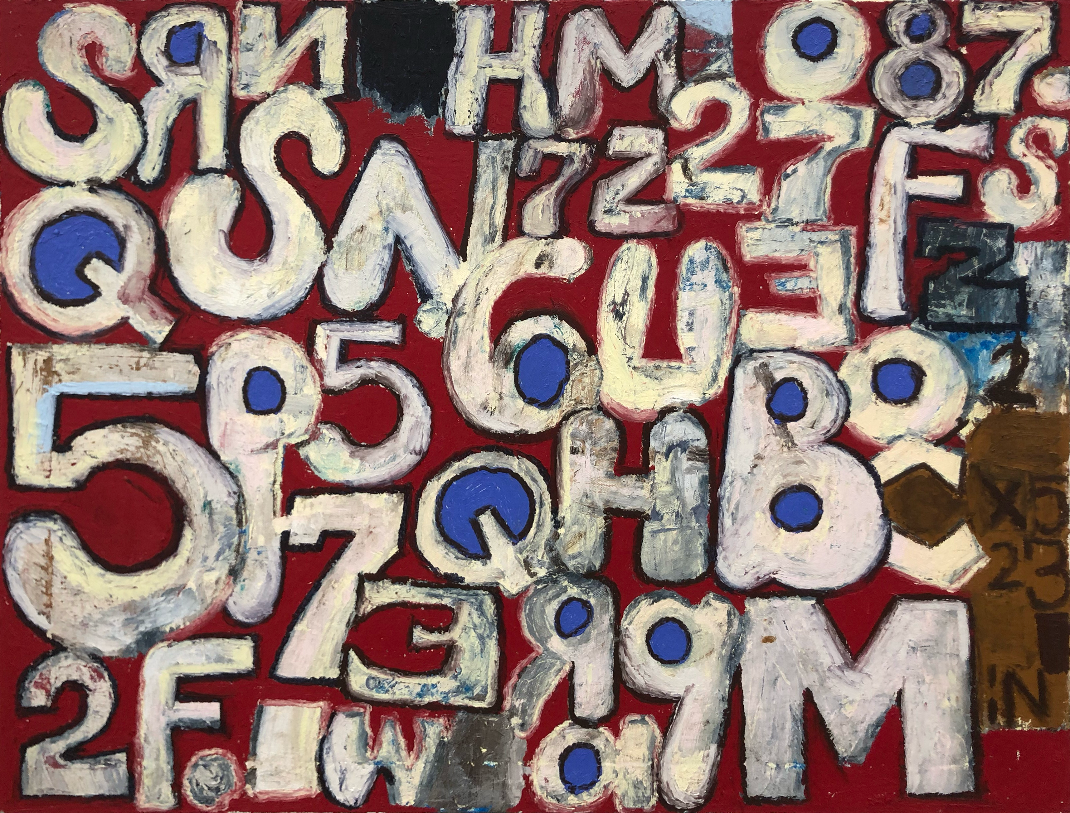 The paintings in "number racket" grew out of a series of oil stick drawings and also some marker drawings that I have been chipping away at for the past year. About six years ago, I started making tightly-wound, abstract paintings and drawings consisting of manic scribbles, stuttering marks, and blobs of color. When "working abstractly, you occasionally stumble into the representational, and there is the option to either embrace or destroy it, or side step it. I’d be working on a painting and letters and numbers would emerge, and I would invite them in, call out to them, until eventually I found a way to paint/draw these letters and numbers. You can write out letters and numbers and you can draw them, and I'm interested in that difference. Every painting I do is rooted in drawing, and I love dragging one wet line of paint into another. I put the paint on rather than scrape it down so I can build it thick then back up again, scribble them out and then repaint them, usually working wet-into wet. As paintings go they are simple enough, consist- ing of figure, ground, and contour, each a different color. The "figure" in this case are the letters and the numbers, and even those to me are not as important as the negative space shapes between everything on the painting. the color is there to activate the negative space. I usually try to paint until something unexpected happens, whether it be a color choke, mark, or just the overall structure of the painting.
